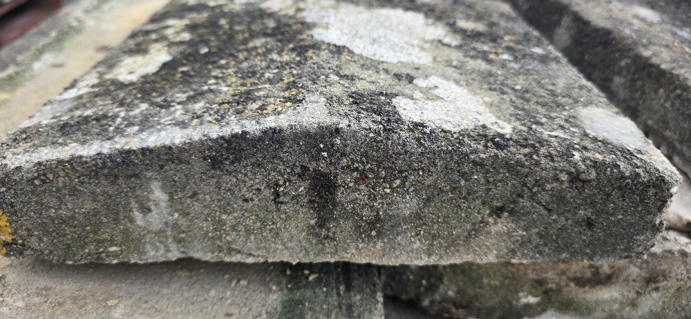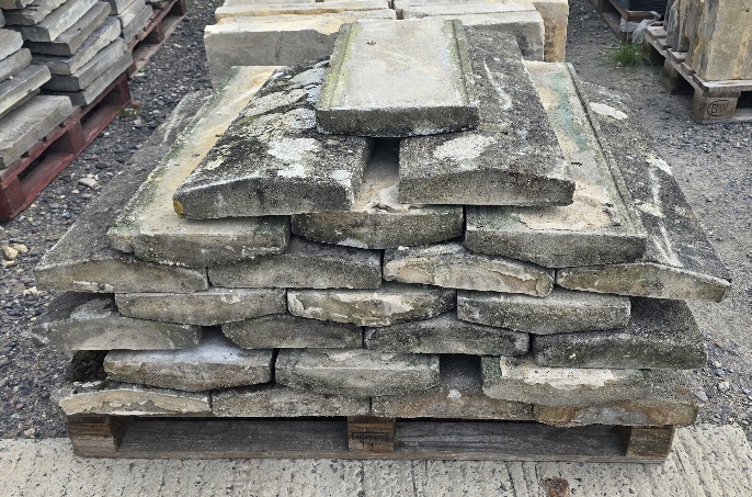 Reclaimed Twice Weathered Reconstituted Copings. 2in Sides to 3in Apex. 70 Foot Available. £15.00 per Foot. Nicely Weathered